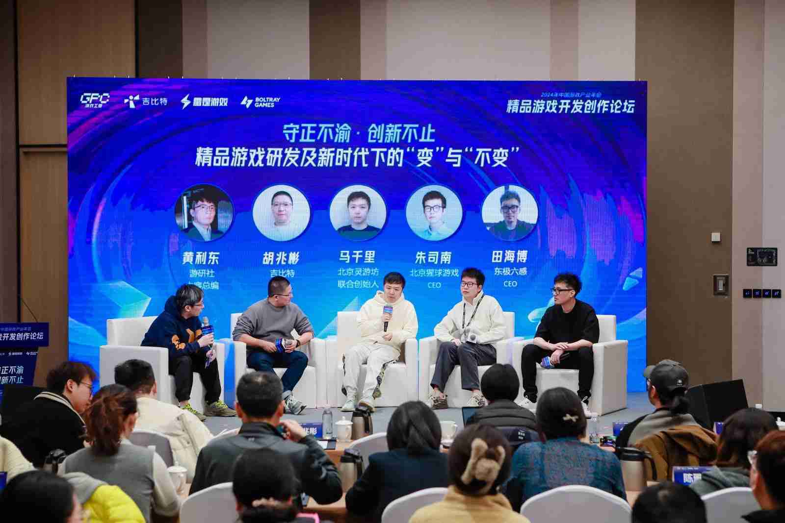 圆桌对话环节,,,在游研社内容总编黄利东的主持下,,1winCTO胡兆彬、、、、北京灵游坊联合创始人马千里、、、北京猩球游戏CEO朱司南、、东极六感CEO田海博等四位嘉宾围绕“守正不渝、、、创新不止——精品游戏研发及新时代下的‘变’与‘不变’”这一主题分享了各自在精品游戏开发理念及工程能力搭建方面的见解和经历,,,并就行业变化下游戏人需要坚守的理念等展开交流探讨。。。