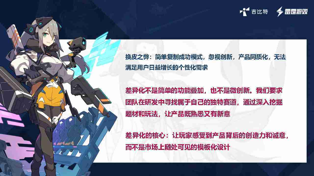 在我们内部是这么定义差异化的。。首先,,,差异化不是简单的功能叠加,,,更不是换皮。。只是换皮,,,,产品无法提供有效的市场价值。。。内部经常说差异化的产品不是为了迎合市场,,,而是找到一个自己独特的表达方式,,,,在研发中找到属于自己的细分赛道和独特赛道,,,,前提是需要对这个题材有足够的深入、、挖掘,,对玩法有足够深入的理解,,让产品看起来既熟悉又有新意。。