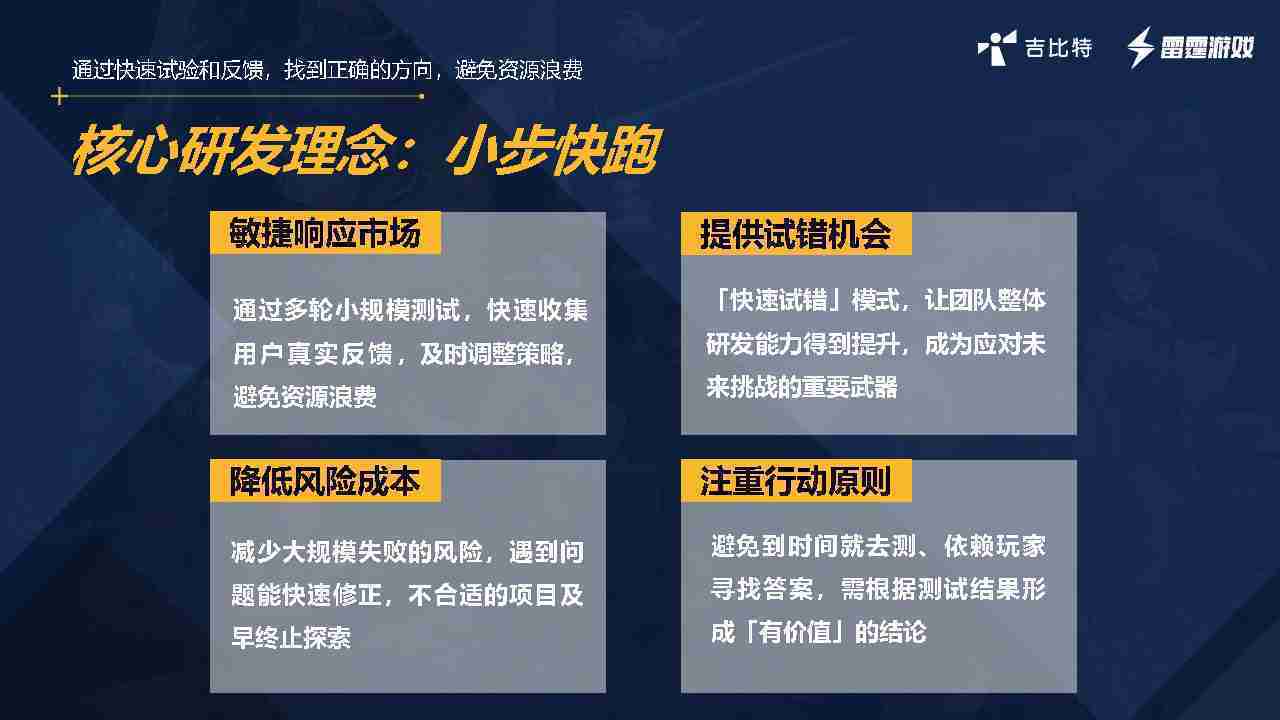 小步快跑不是找答案,,而是验证答案。。。。我们之前有项目是这样的,,,,有些制作人会有几个方向觉得都可以做,,,但是不确定做哪一个,,会选择几个都做,,,做完拿到市场跑,,,,跑出哪一个更好,,,,基于这个再做后续的研发和拓展。。。。但这种情况最容易出现一个问题,,,可能被玩家裹胁,,,玩家说这个点不错、、、、那个点不错,,,到底听还是不听,,不听感觉是无视玩家的反馈,,听的话,,可能自己没想清楚导致研发思路发生偏颇。。。所以针对这一点后面自己复盘整理,,,,发现制作人自己心里要有数,,,要做自己觉得好玩的,,而且明确知道这个东西是你想做的,,,,然后拿到市场验证这个答案是不是对的,,,而不是拿一堆答案找哪一个答案更好。。。。