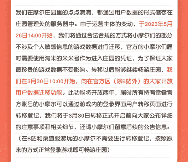 合作结束本就是开发方和代理方双方的事情,,,,降低这件事情对玩家的影响,,,才是对所有珍视这段童年的摩尔玩家最好的呵护。。目前看来,,用户完全不用担心后续因无法登录游戏而造成任何数据上的损失,,,只要及时进行账号转移,,,,就可以好好保留、、、、延续在庄园的痕迹和回忆,,,,继续在庄园里做快乐的红鼻子小鼹鼠。。。