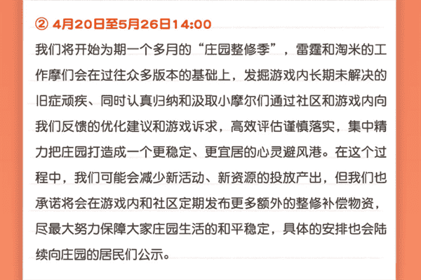 合作的结束并不意味着这个童年IP的结束,,,对于《摩尔庄园》手游而言,,,,这是一个新阶段的开始。。后续游戏内将开启庄园重构计划,,会就以往遗留下来的BUG进行集中修复,,并在游戏内和社区定期发布更多补偿物资。。