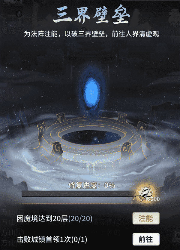 当你修为达到返虚/破虚中期后,,,可在城镇寻得芸丫并激活神秘法阵,,,通过收集材料、、击败首领等方式为法阵注能,,借以打破三界壁垒,,,,开启支线剧情“清虚旧梦”
